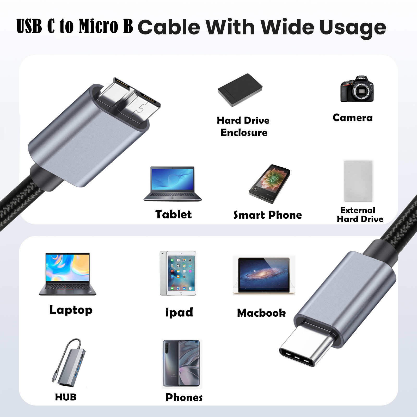 The USB Type-C to Micro B connection cable allows computers/PCs/laptops with USB Type-C ports to connect to external hard drives, smartphones, or tablets for data transfer and charging. Note: This is a USB C to Micro USB B connection cable. It is not suitable for standard USB-A ports or Micro USB 2.0. Not applicable to iPhones.